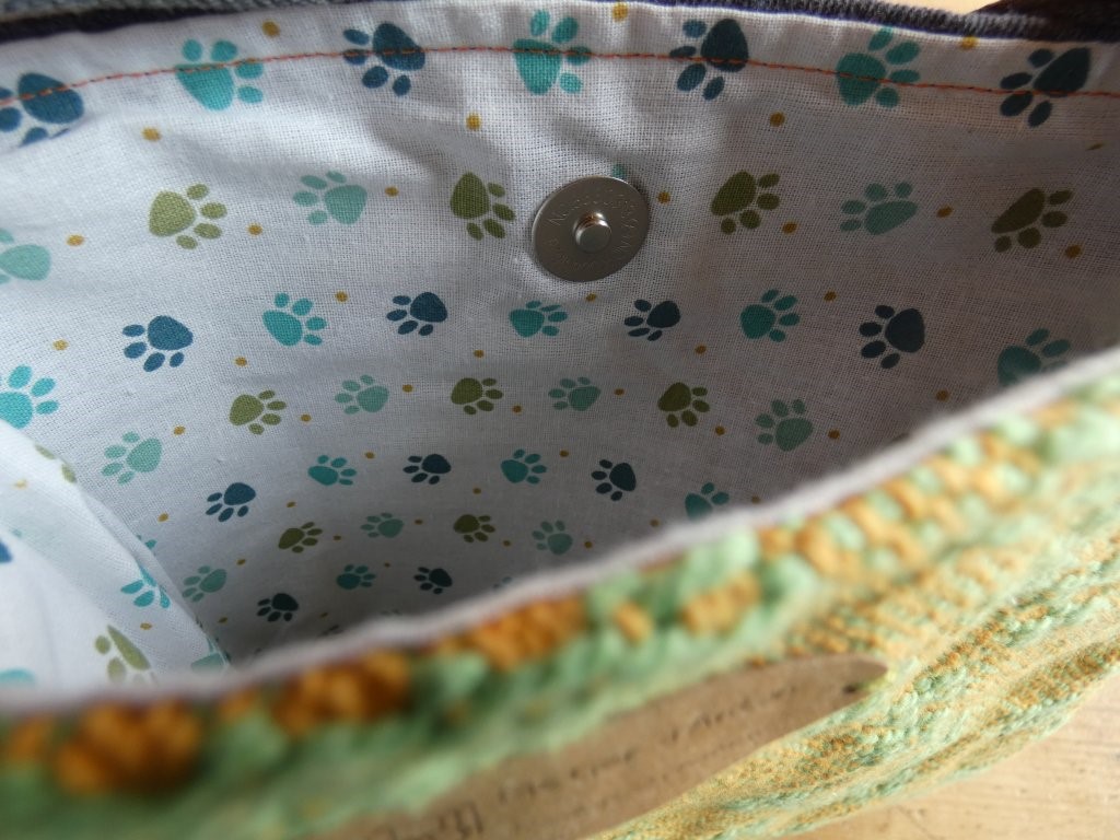 Un bouton pression magnétique permet son ouverture / fermeture. L'intérieur est doublé en coton.
