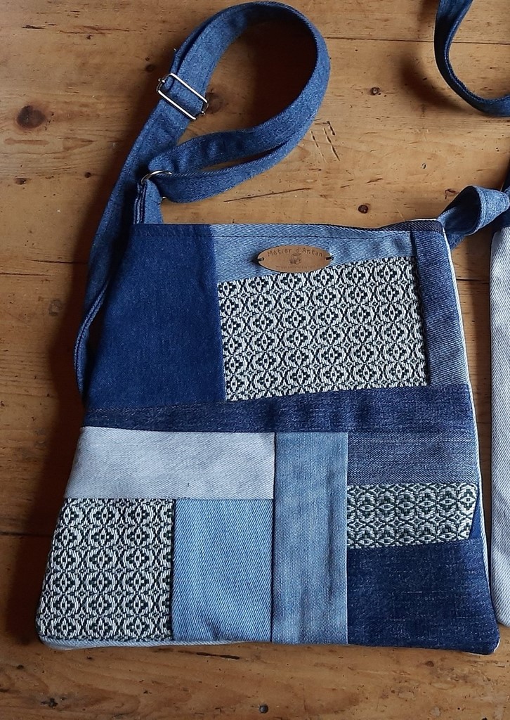 Ce sac est constitué d'un côté tissé en coton et de jeans recyclé, l'arrière et la sangle sont aussi en jeans recyclé.