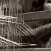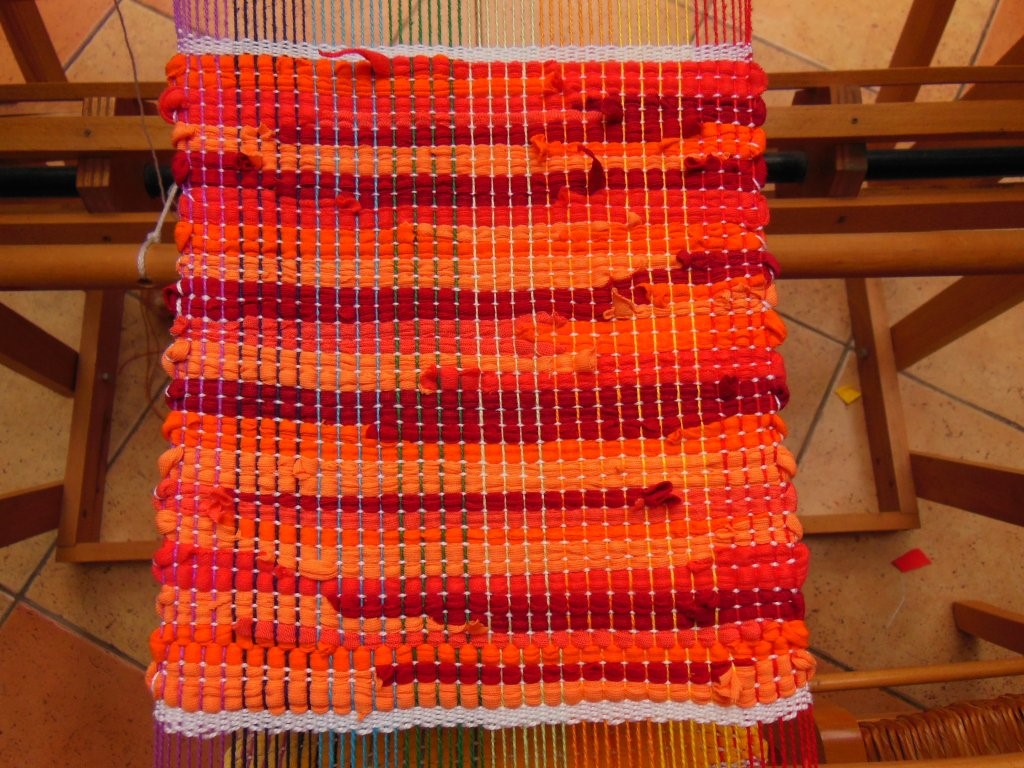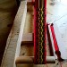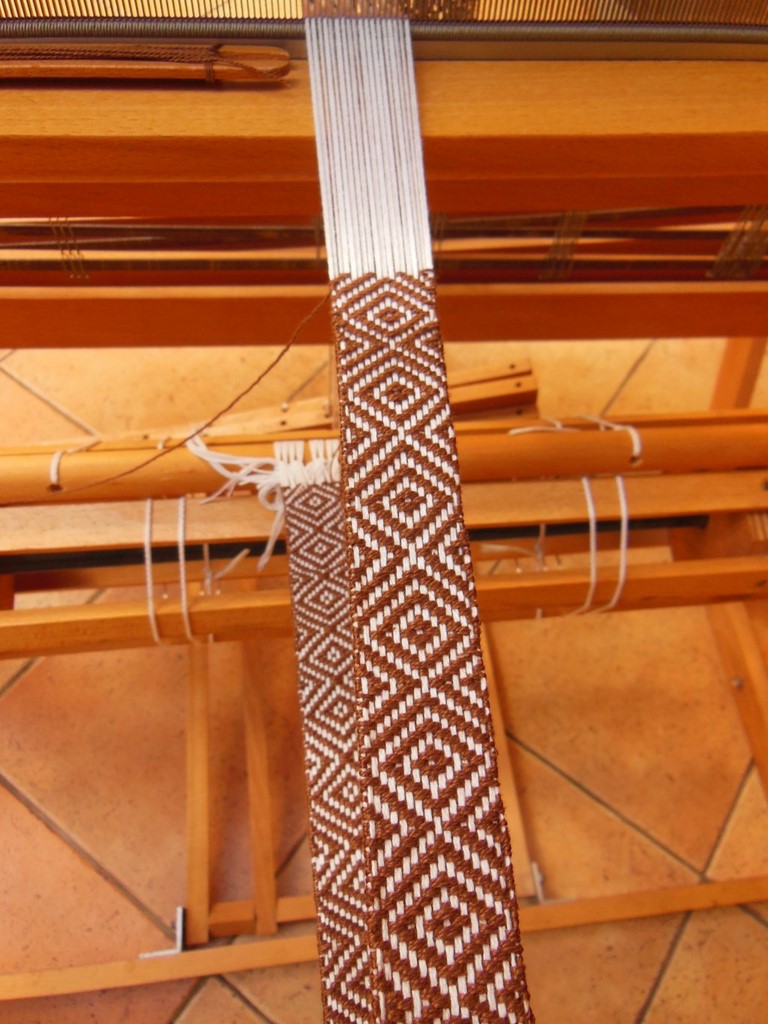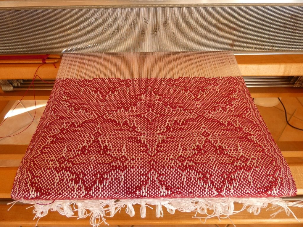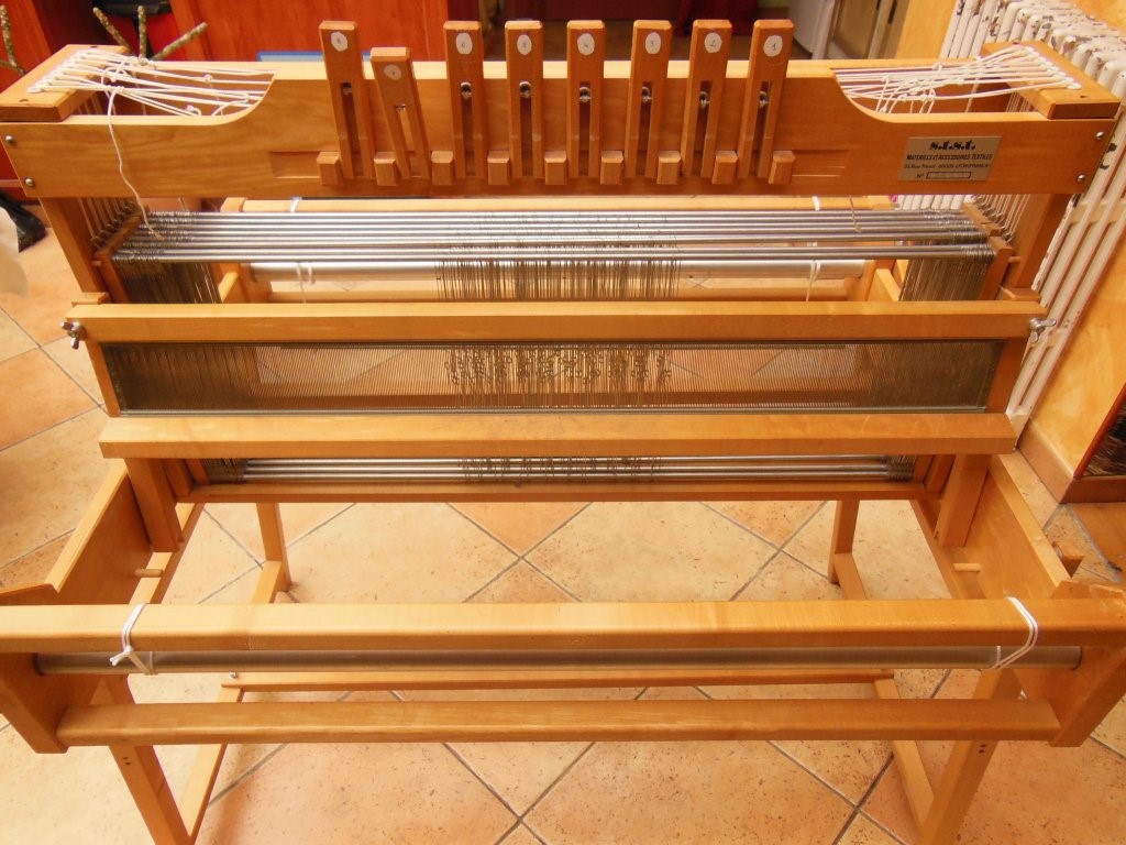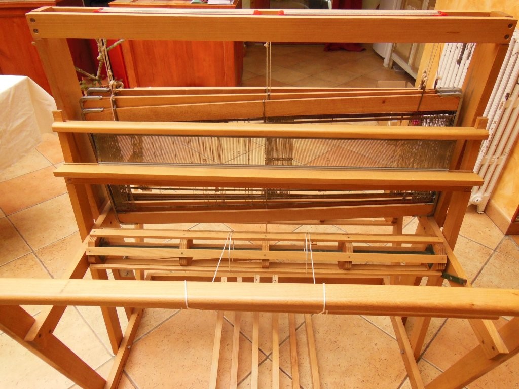 Les lisses sont en coton, ce qui, sur le moment ne m'a pas facilité la tâche ayant appris à tisser sur des lisses en fer. Ces dernières glissaient moins rapidement me semblait-il. Aujourd'hui je ne fais plus la différence. J'apprécie aussi bien les lisses en coton qu'en fer.